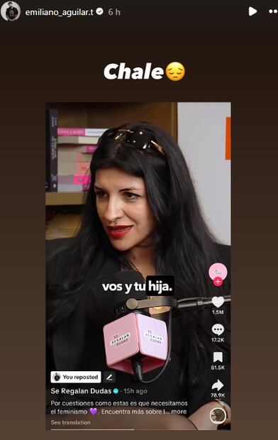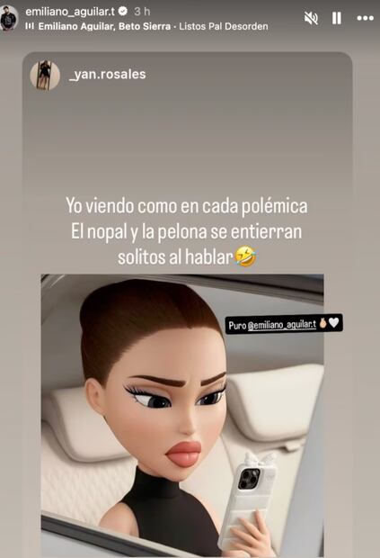 Sobre la captura de esta entrevista, Emiliano escribió la palabra “Chale” como una forma de lamentar lo ocurrido con Cazzu. En otra publicación, el rapero compartió un meme de una fan en la que se lee: “Yo viendo cómo en cada polémica, el nopal y la pelona se entierran solitos al hablar” [sic].